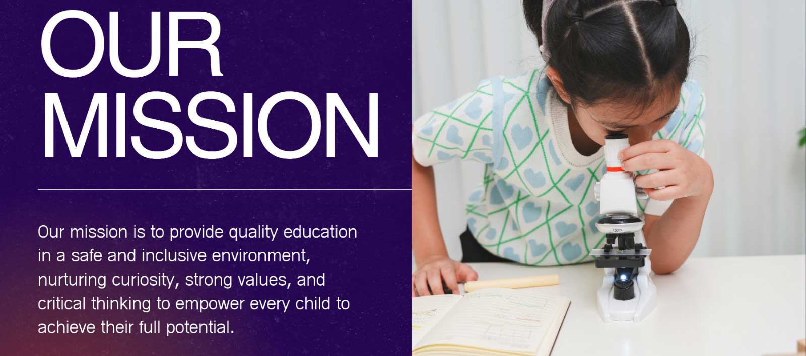 Our mission is to provide a safe, supportive, and inspiring learning environment where every student is encouraged to achieve academic excellence, develop strong character, and become a confident, responsible, and compassionate global citizen. We are committed to nurturing each child’s potential through quality education, innovation, and values-based learning